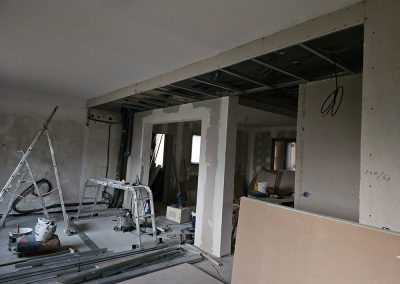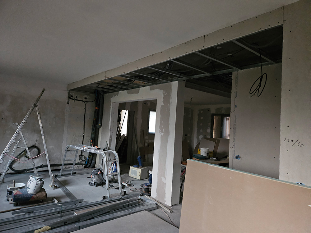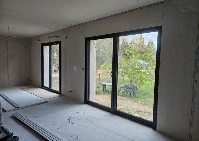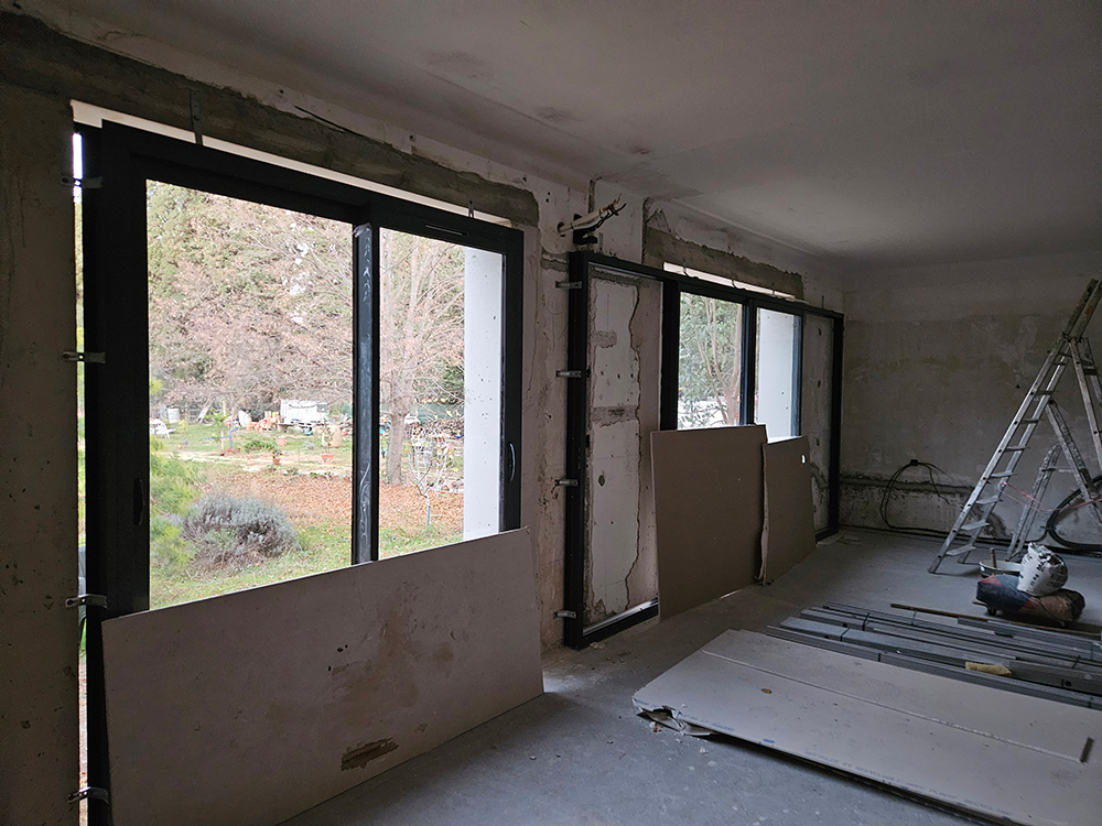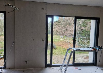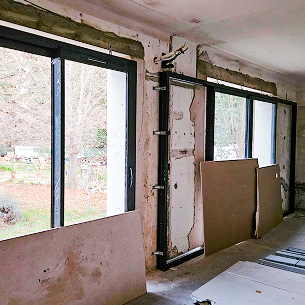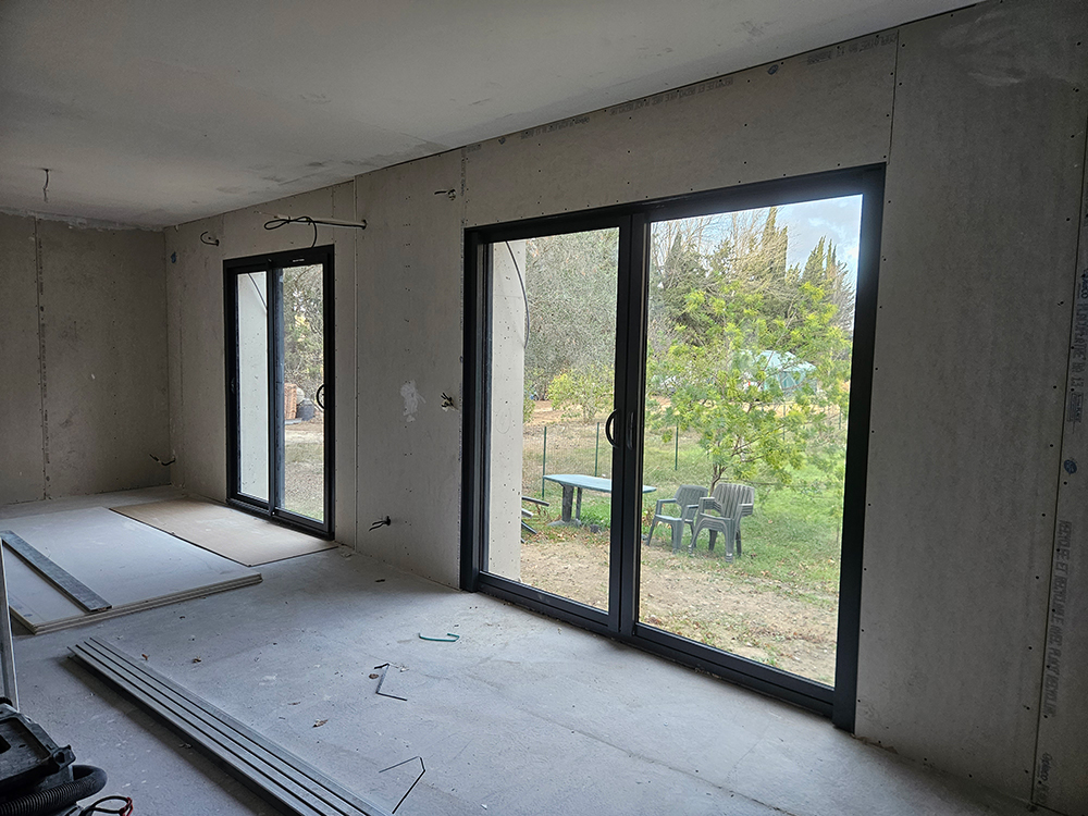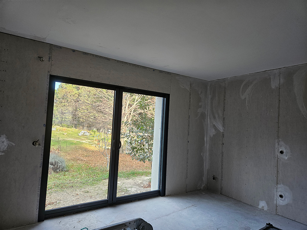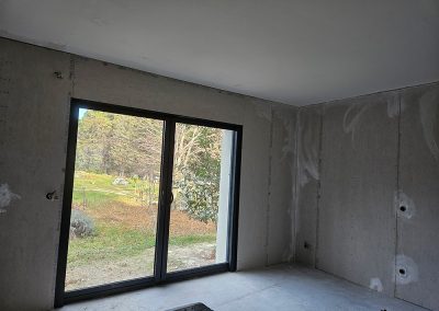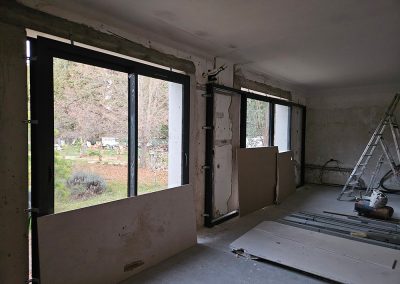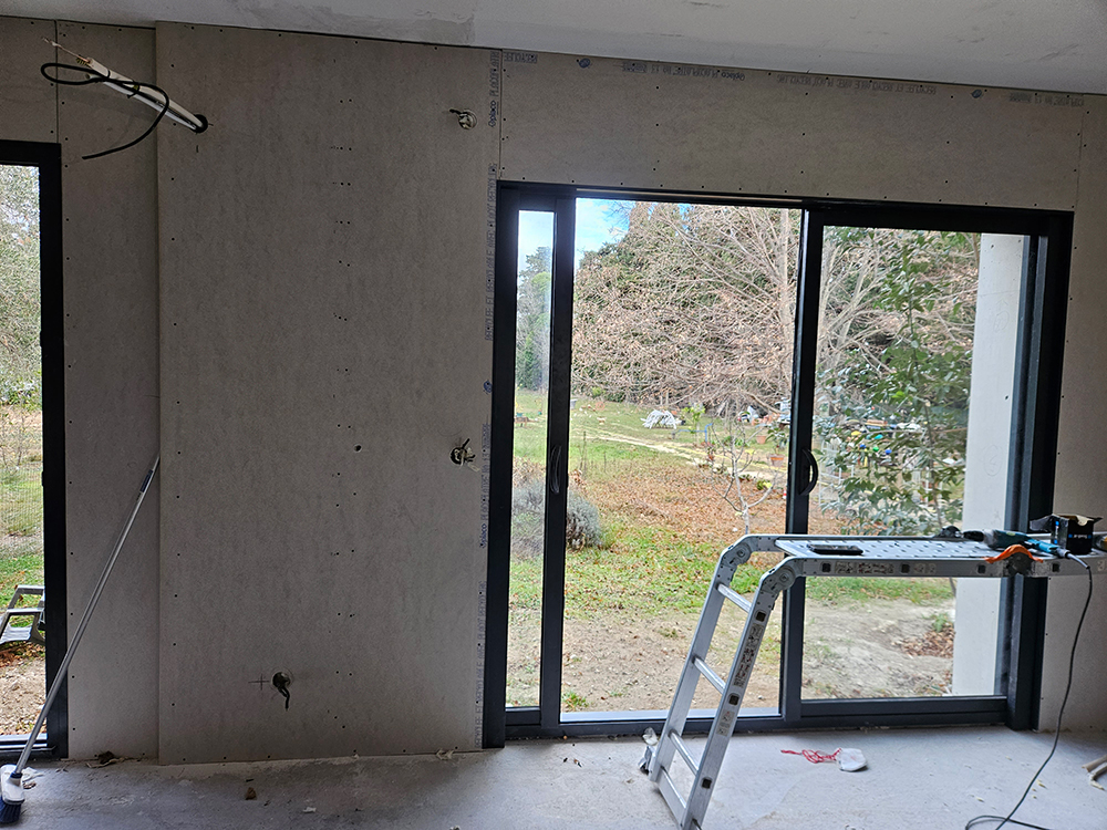 Habillage du mur du salon avec isolation en Placostyl sur baie vitrée à galandage et baie vitrée simple.