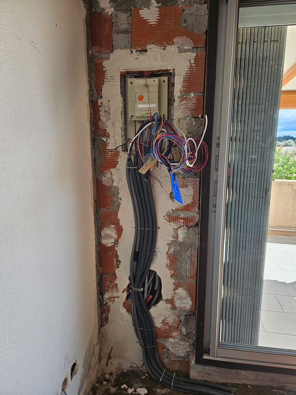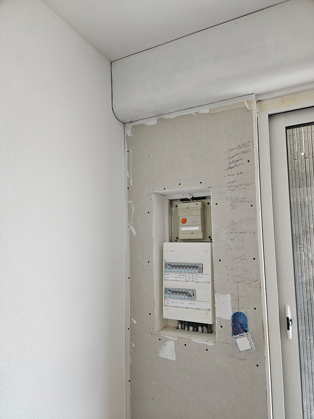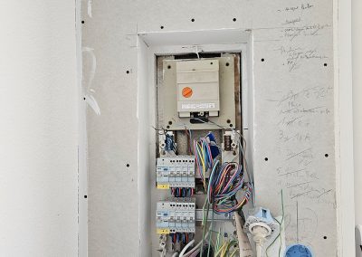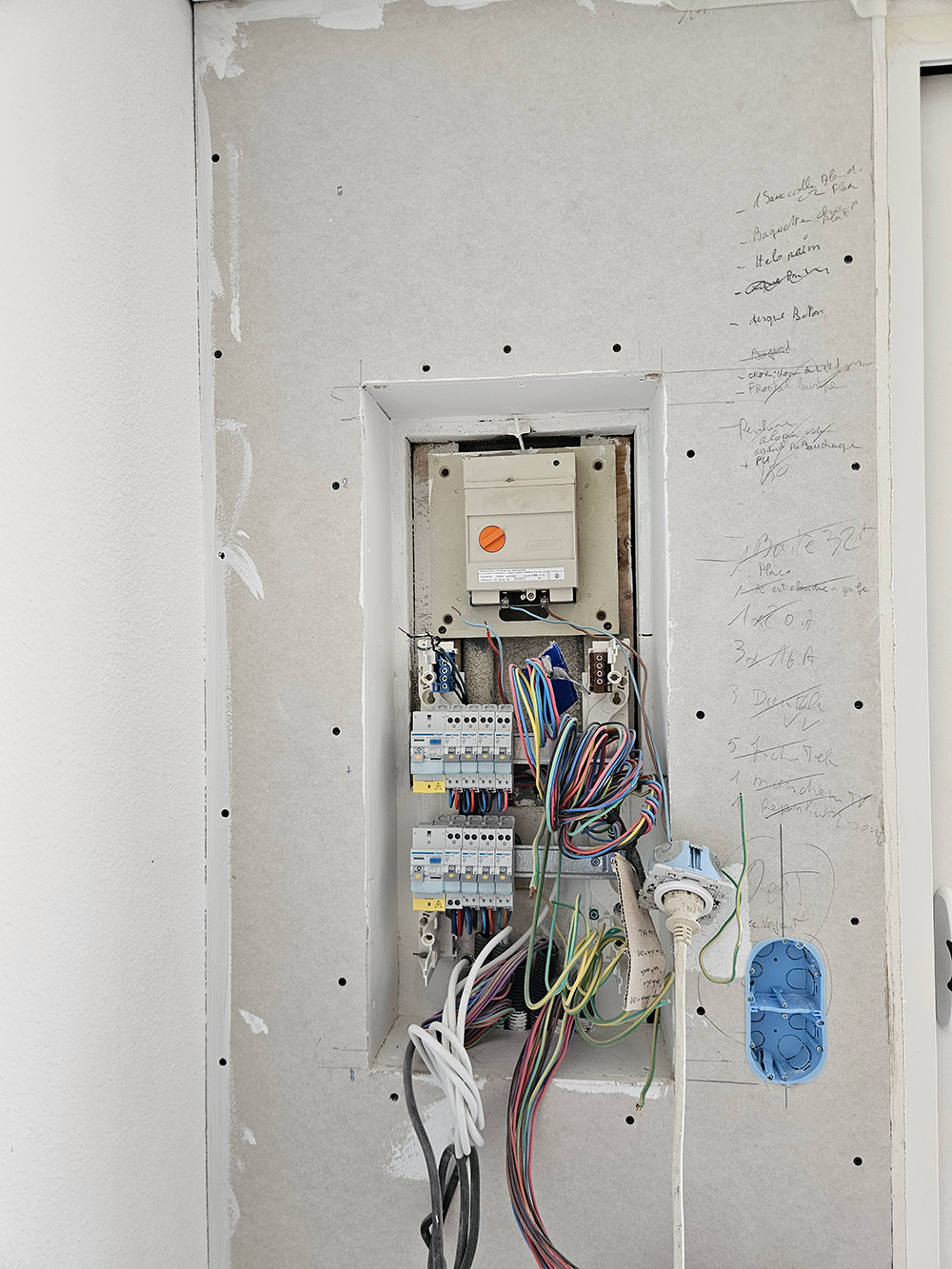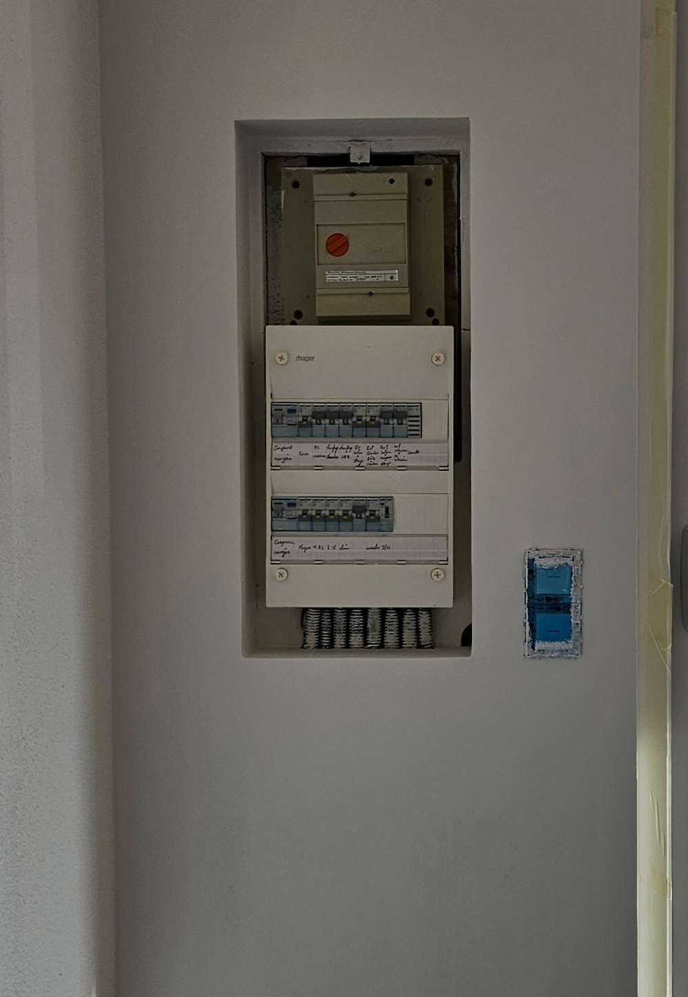 Remise aux normes de l’ancien tableau électrique avec remplacement du différentiel 32 MA et du disjoncteur.