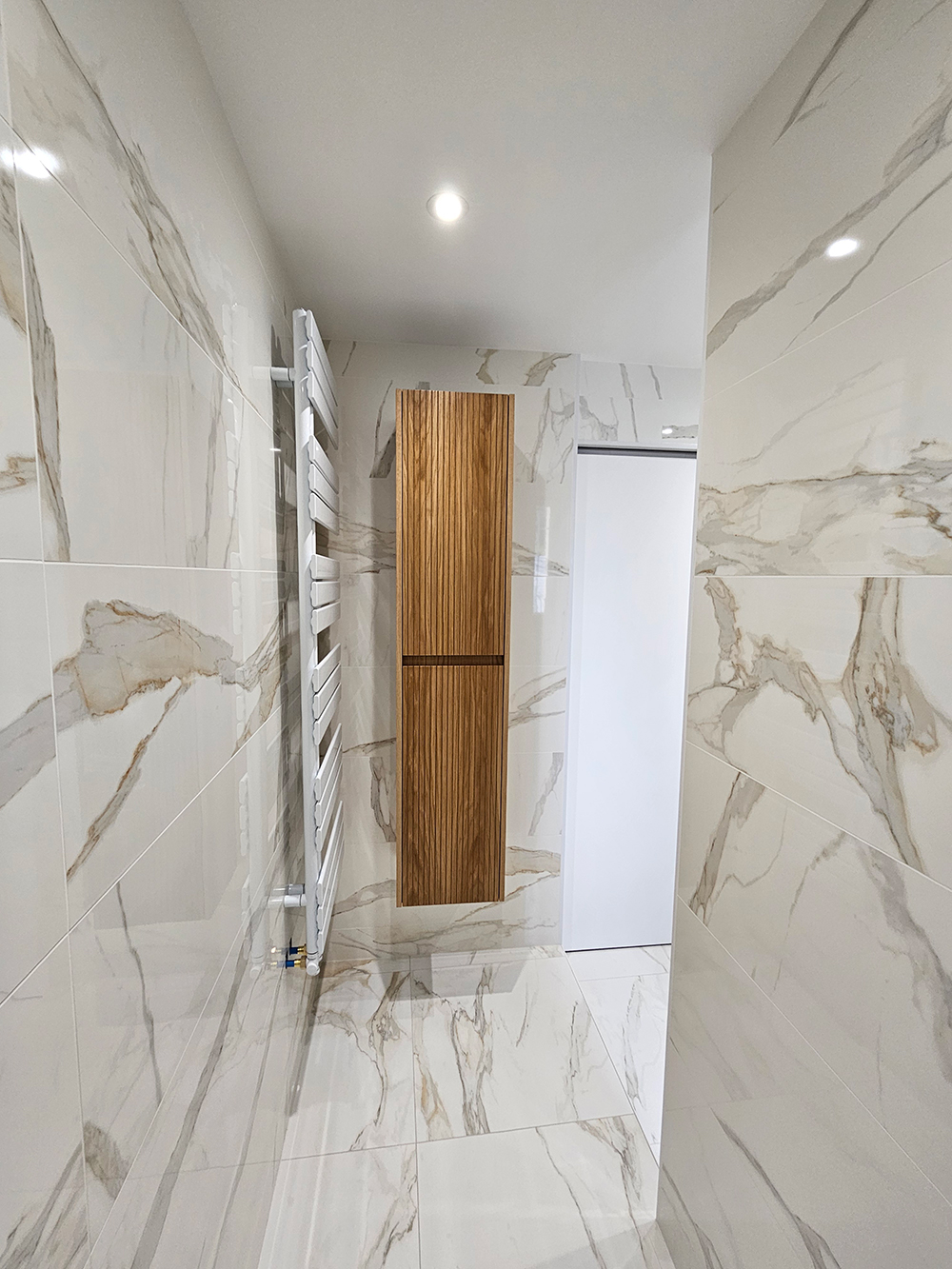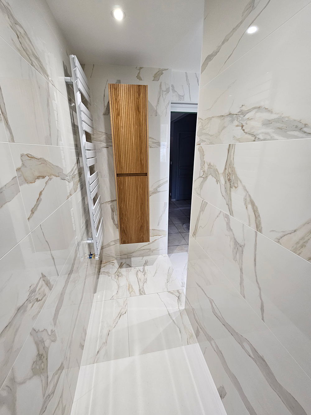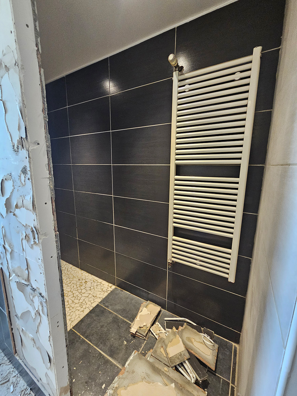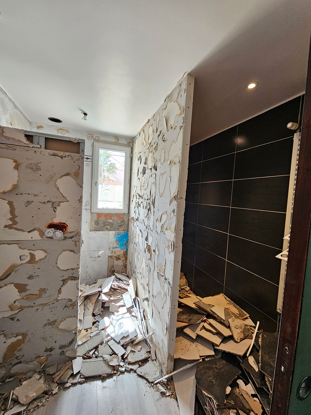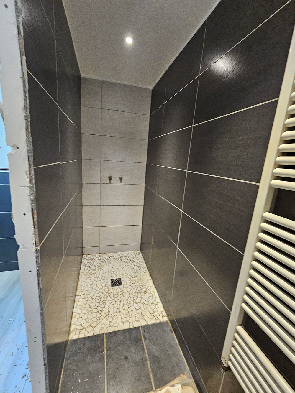 • pose de nouveau carrelage au sol, de faïence, et de robinetterie.