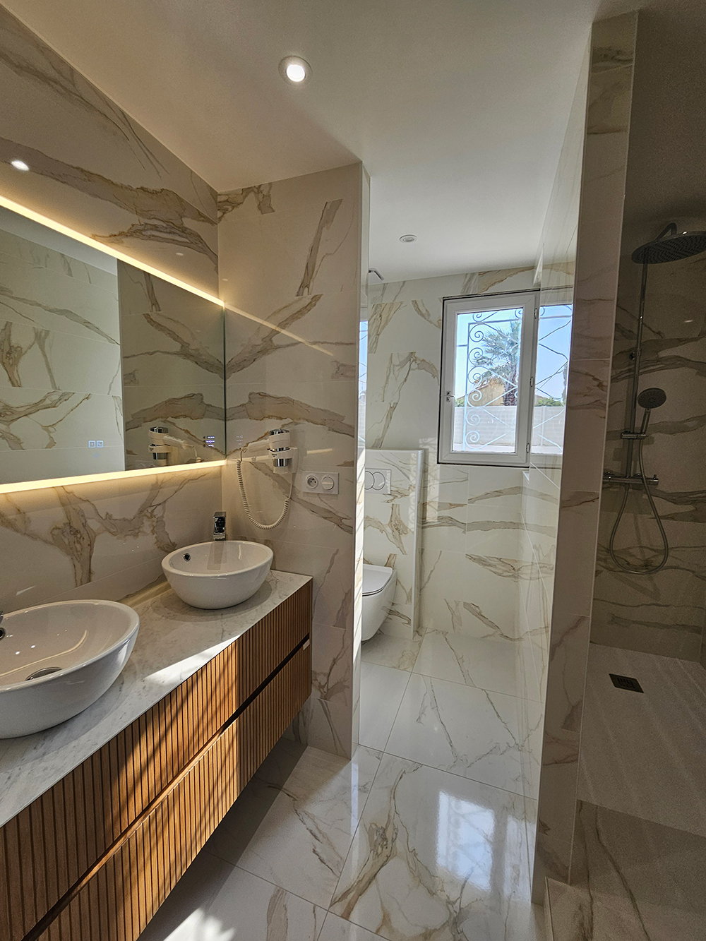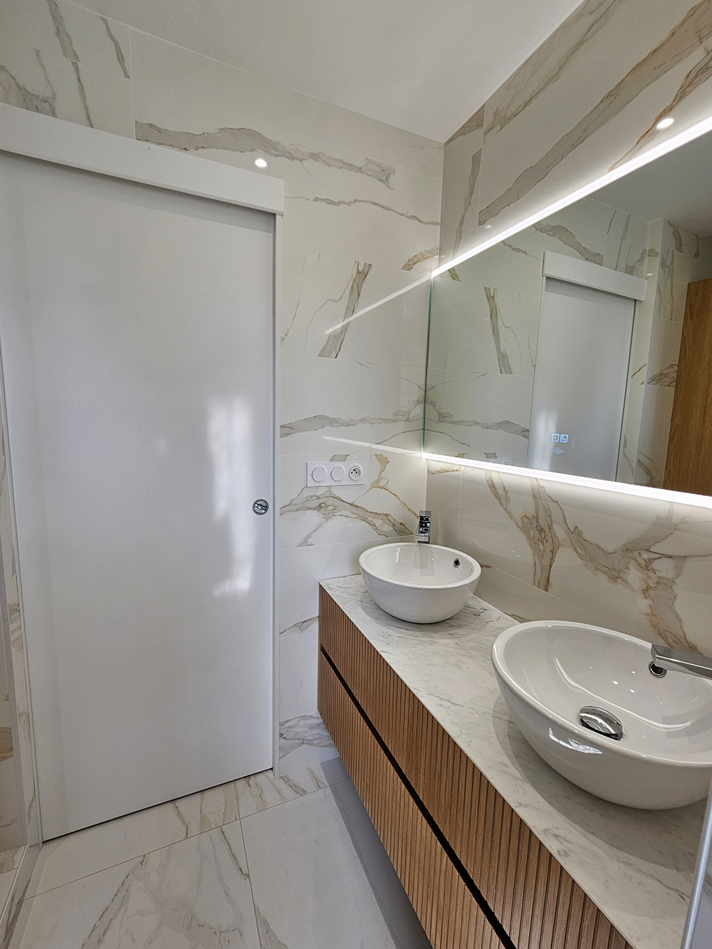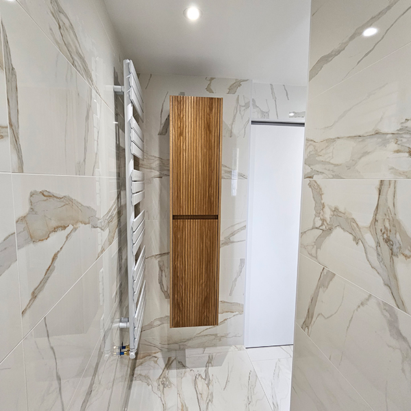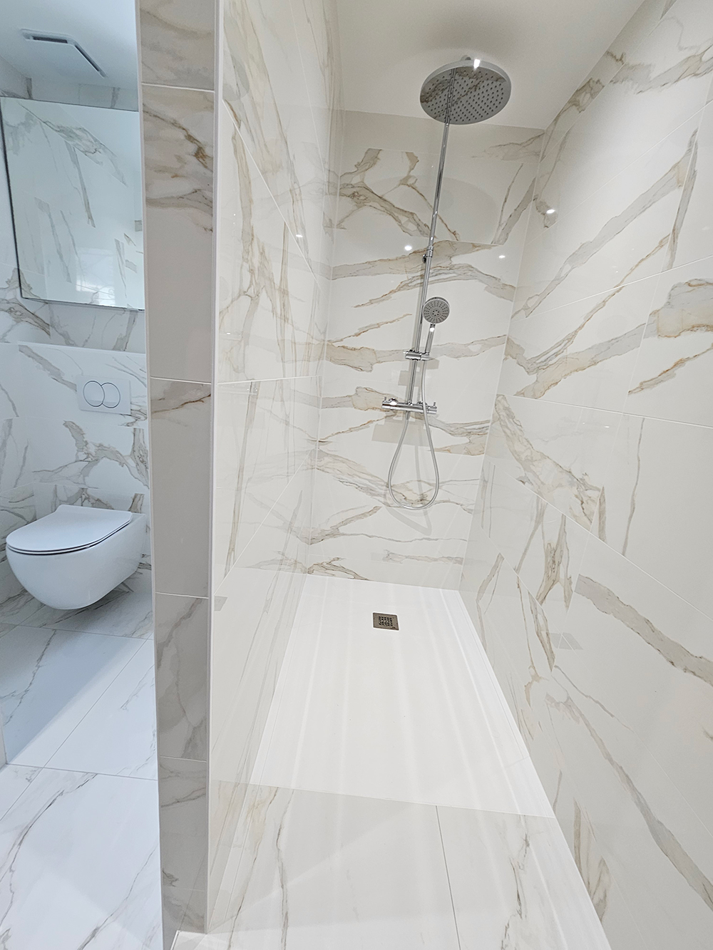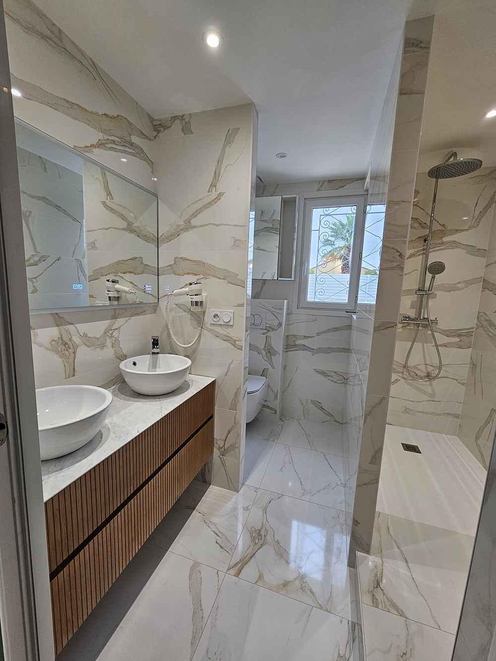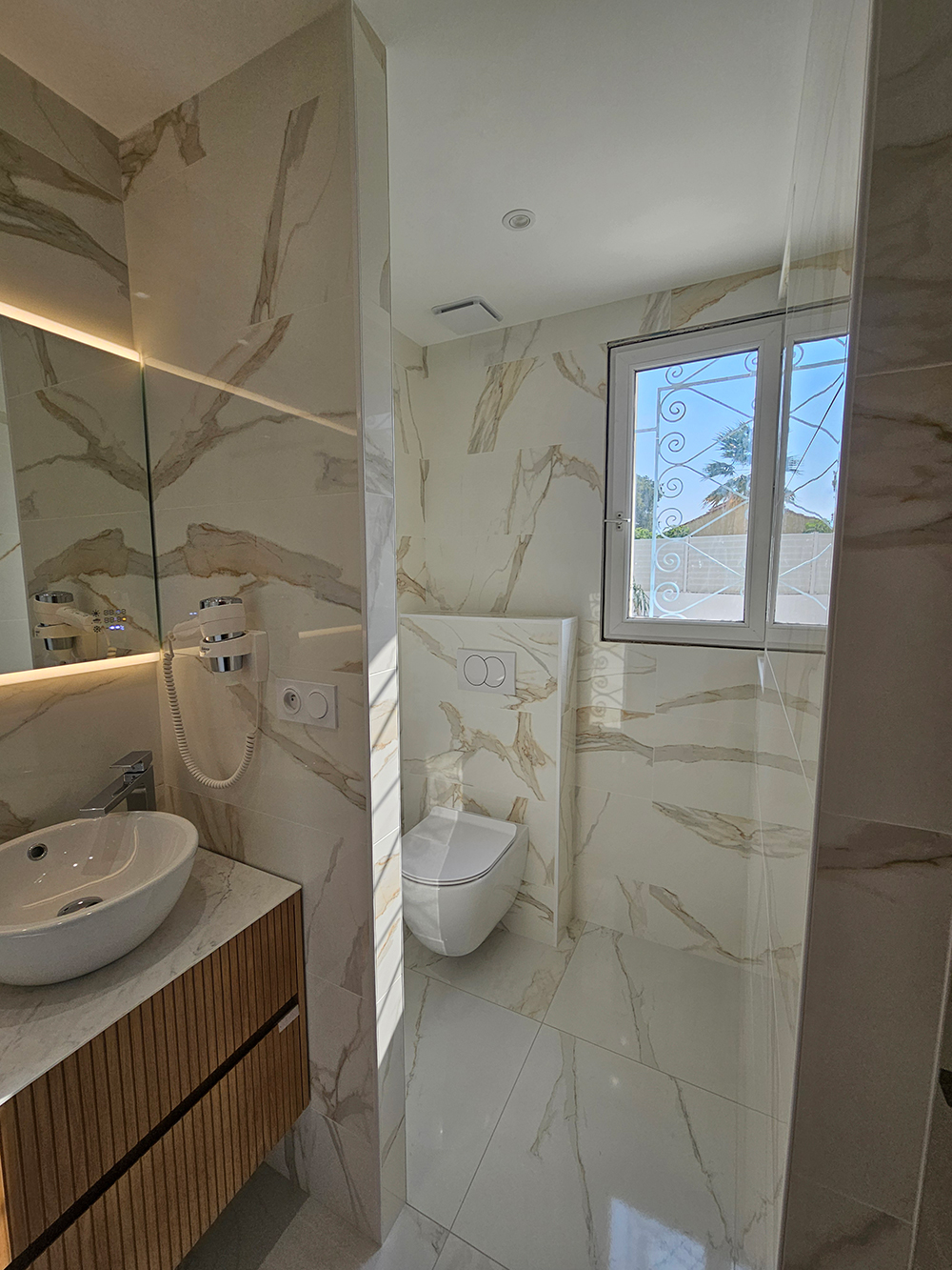 • pose de nouveau carrelage au sol, de faïence, et de robinetterie.